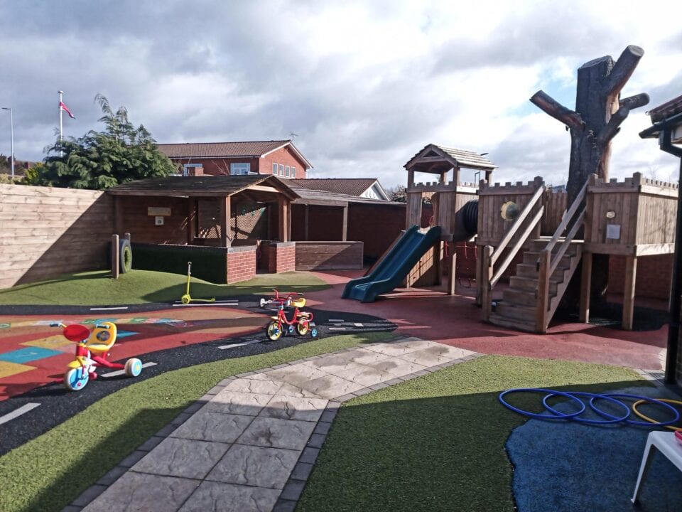 - We have a large forest school area where children are free to explore different resources and experience natural world play
