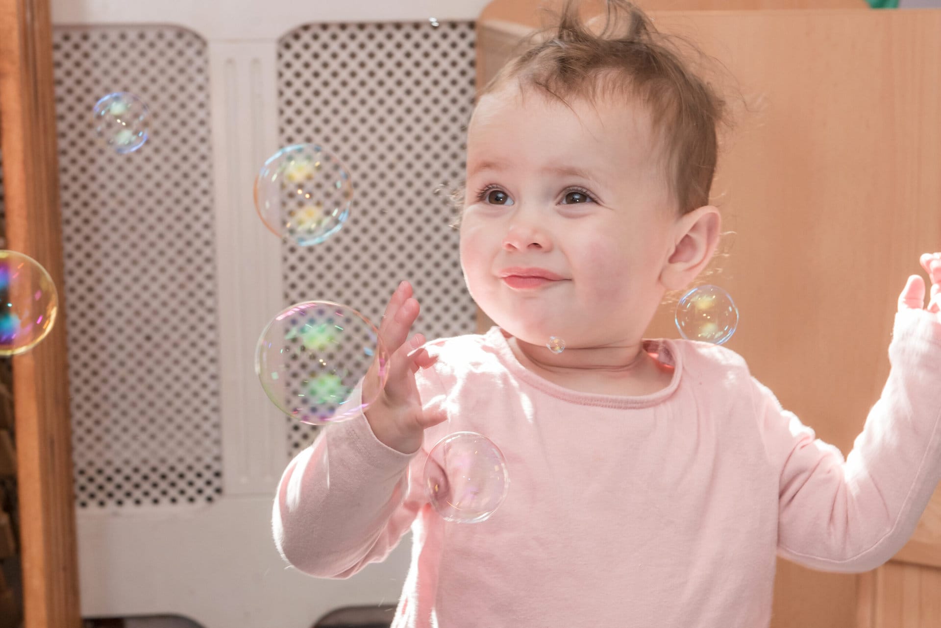 Our nursery spaces are carefully designed to provide children with a variety of play and learning choices. Our team ensures children are challenged throughout the day, this may be our babies crawling to meet new friends, counting steps on the stairs, simple phrases in different languages or becoming a doctor at role play.